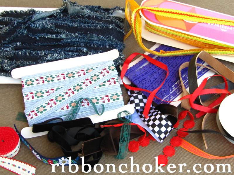 For myself, I like to recycle ribbon into chokers or bracelets. I'll use the ribbon scraps that come on gift boxes or even a good section of an old leather belt. Fabric remnants work great as long as the edges are either meant to be frayed, but they can be sewn or otherwise treated to keep them from fraying. Sometimes trims need to be sewn to other ribbon or they'll pull apart once clamped.