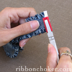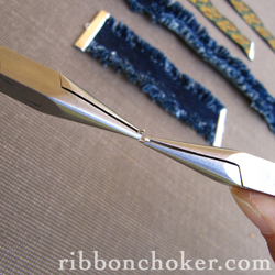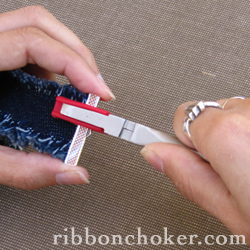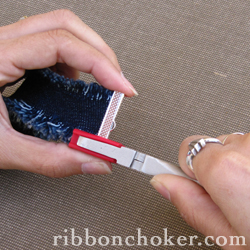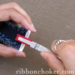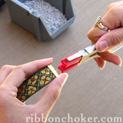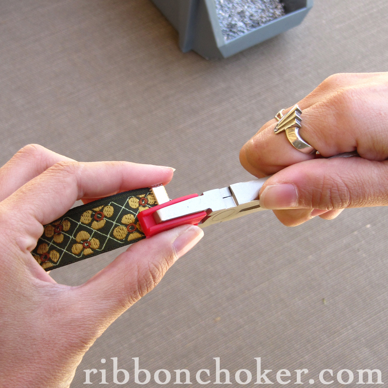 As for tools, sharp fabric scissors work the best on ribbon. But you probably already knew that... Just be sure to cut the ribbon at a straight perpendicular angle so that the clamp will easily sit against it without being crooked.