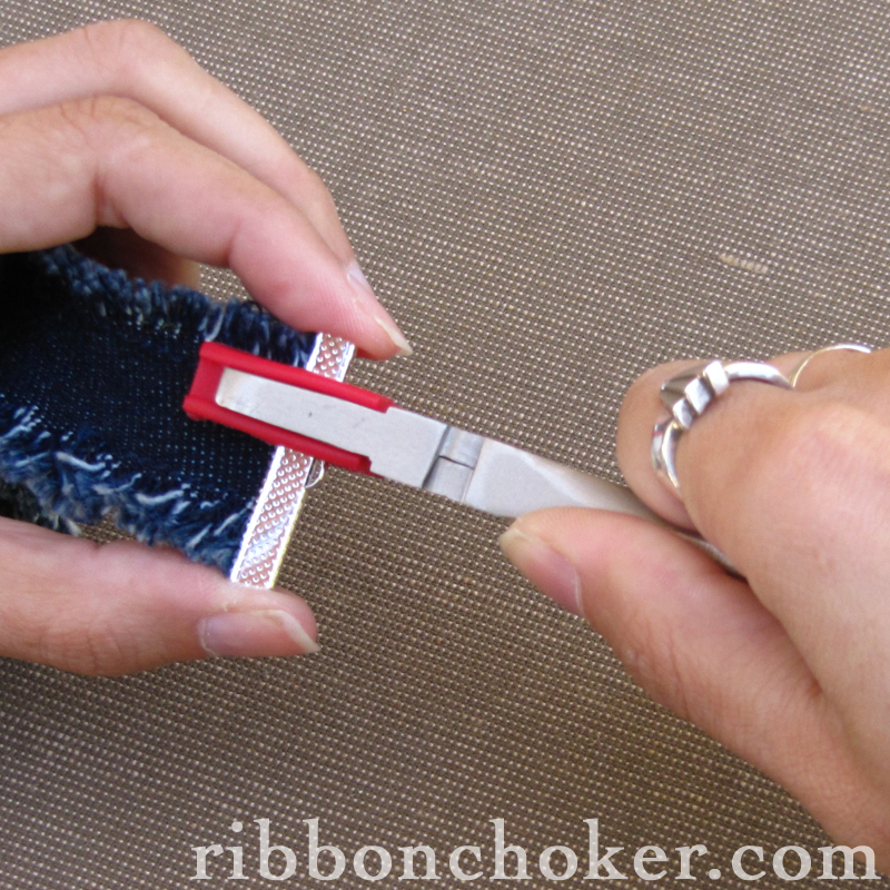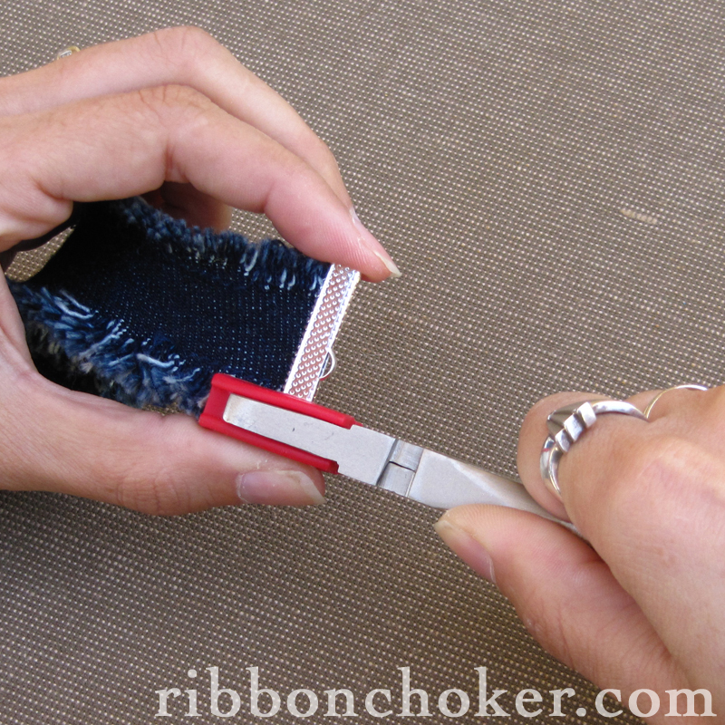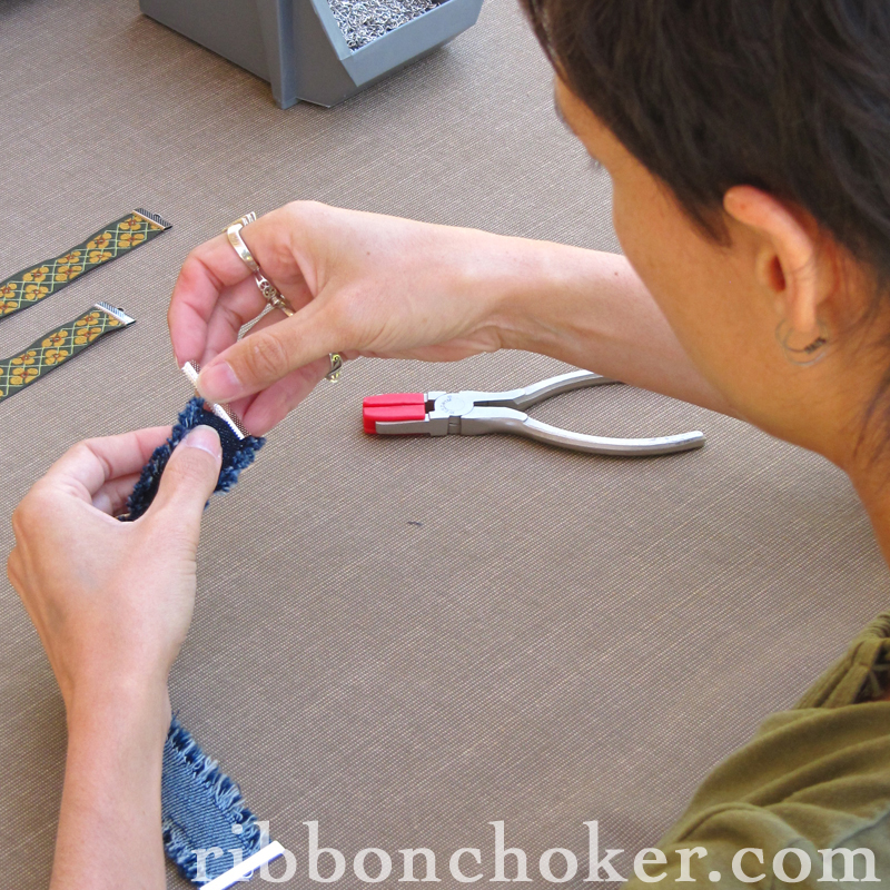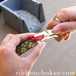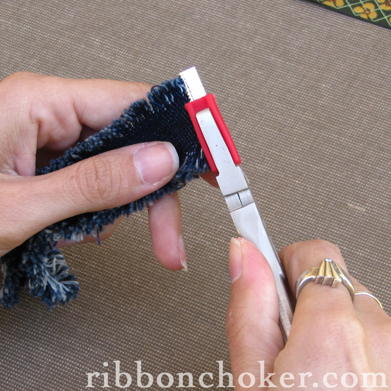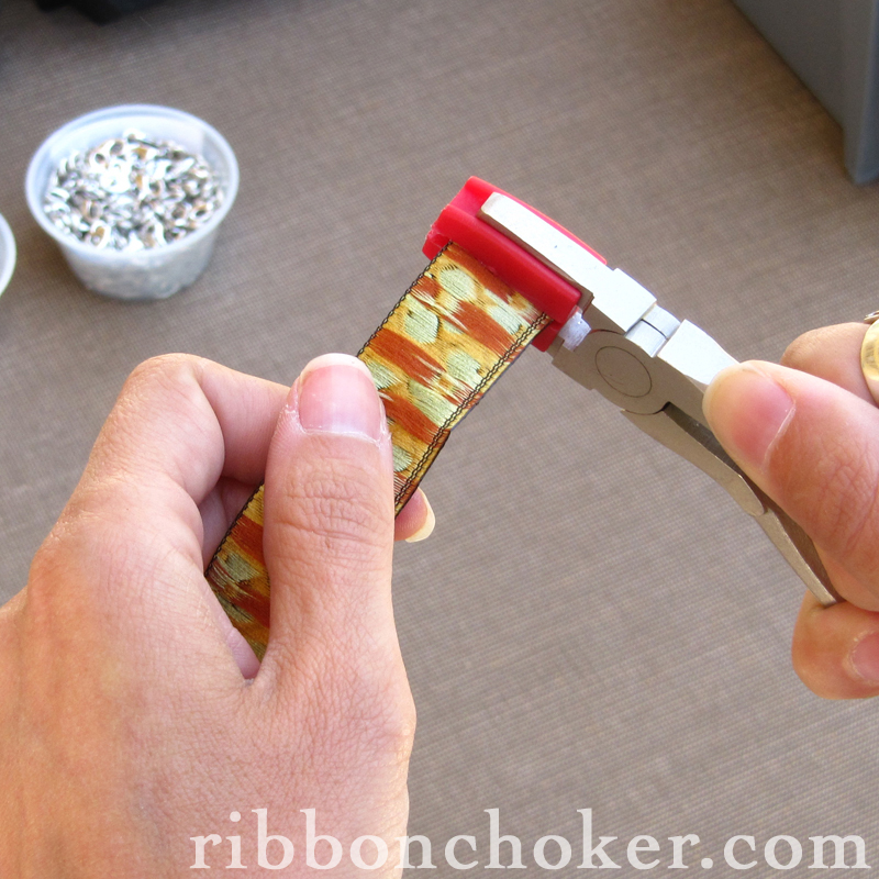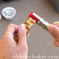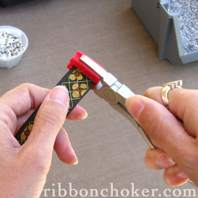 Being right handed, I have the pliers in my right hand, place the clamp in the jaws, add the ribbon with my left hand and sort of hold it all steady while I close the clamp. Sometimes I get my fingers caught in the clamps. It's only a momentary ouch and has yet to leave a mark, but I figured I might pass along the friendly warning. I obviously try not to crimp my fingers, but sometimes it's unavoidable.