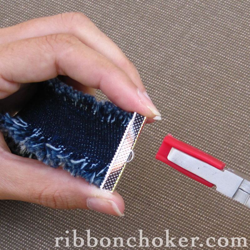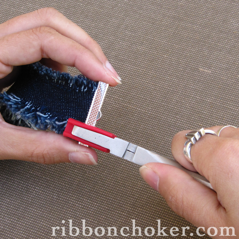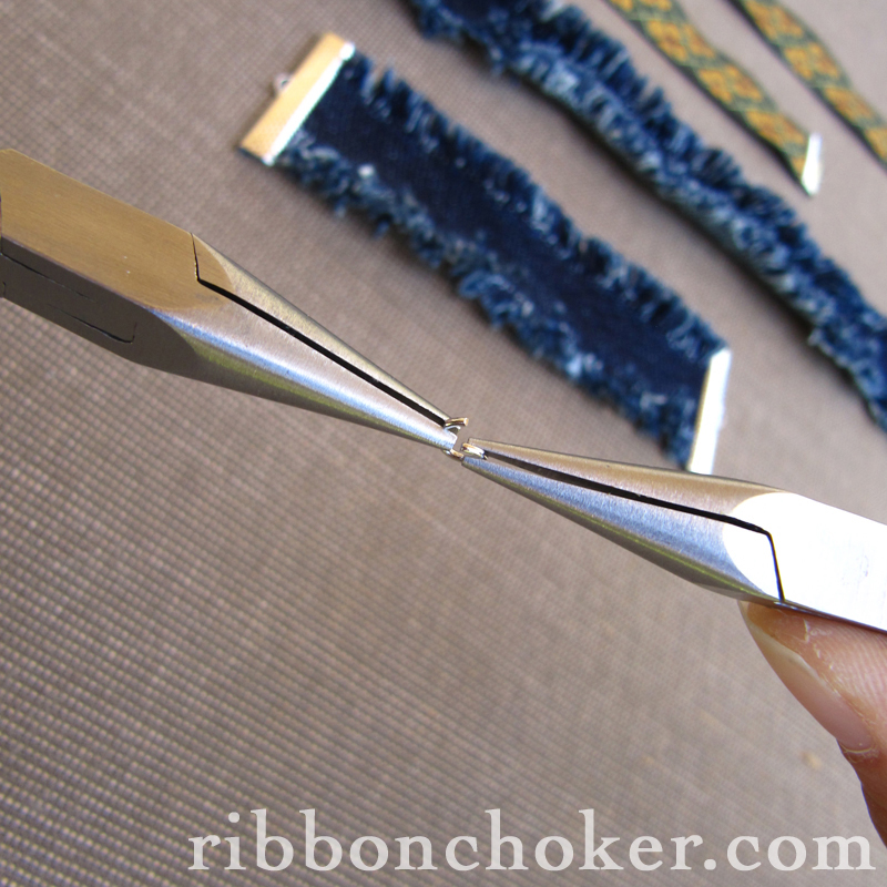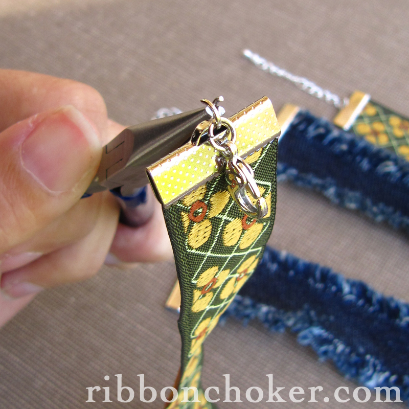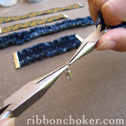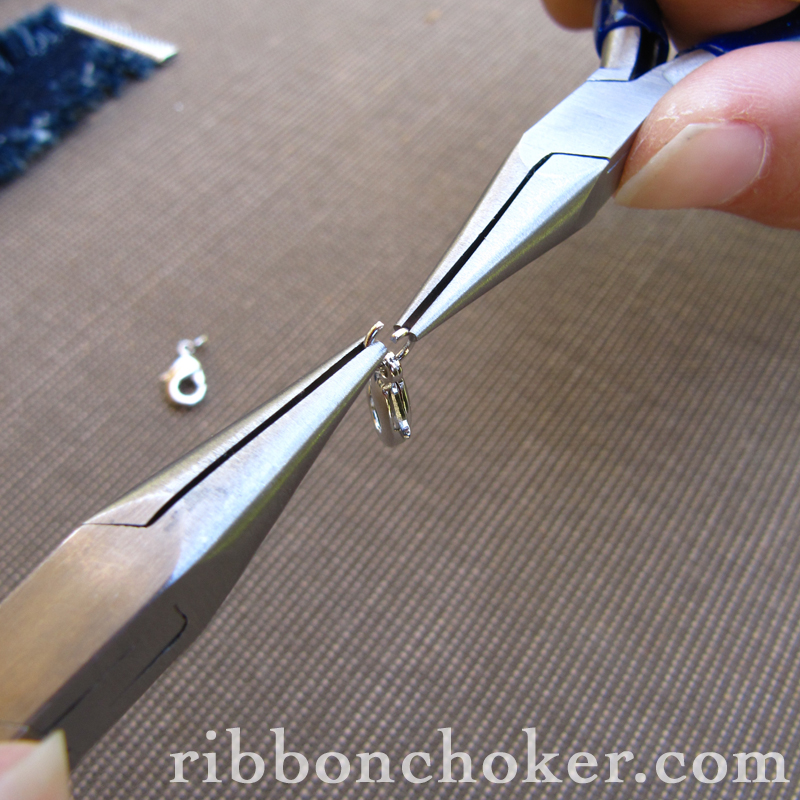 Okay, open the other jump ring. Thread it through the loop on the other ribbon clamp. When you put the clasp on, the lever should be facing the front of the ribbon or the hook should be facing the back of the ribbon. If you're using double-sided ribbon or lace, it doesn't matter which side the hook or lever faces. Close the jump ring.