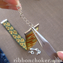 From there, I open another jump ring, place the extension chain and one end of the ribbon in it.