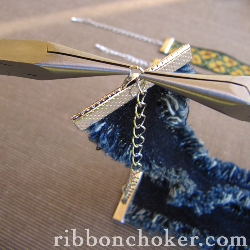 If your ribbon needs to hang in a certain direction, be aware which side needs the clasp and which side needs the chain. I like to hold it up in front of me. If you're using a simple satin or non-scalloped lace, it doesn't matter which side is which. If you're using a scalloped lace (only scalloped on one side) or a ribbon with a pattern that has a top and bottom such as words embroidered or printed on it and you're right handed like I am, the scallop or bottom of the pattern should be on the lower edge, front side up, chain goes on the right hand side, clasp on the left so that when you put the choker on, the clasp is in your right hand. Lefties should put the chain on the left and the clasp on the right.
